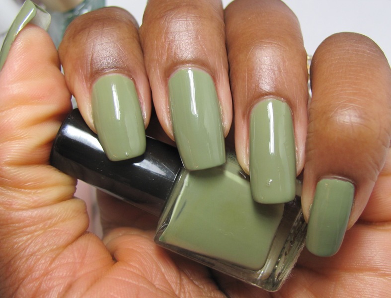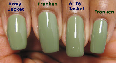 COMMENTS: I was excited to try Army Jacket because it's one of my favorite shades of green to wear. But then I noticed the color looked familiar. What?! I already have this! It's the same color as my franken from October based on a paint chip! Can you tell which is which in the photos? The last photo has the answer.