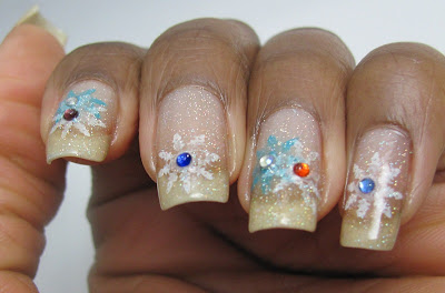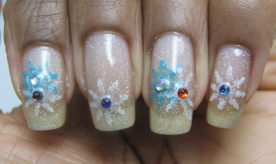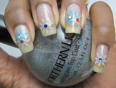 COMMENTS: I wasn't planning to do any holiday-themed manicures (there are more than enough of them out in nail blogland now), but a co-worker asked me to do one. I had planned to use more color, but a headache that night said 'No', so I had to keep it simple. I simply stamped snowflakes over my base coat, threw in some rhinesones, slapped on Northern Lights, sealed with topcoat and called it a night.