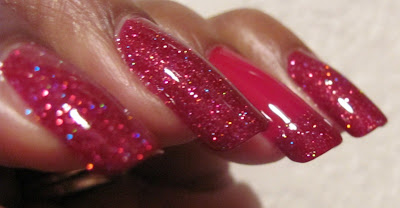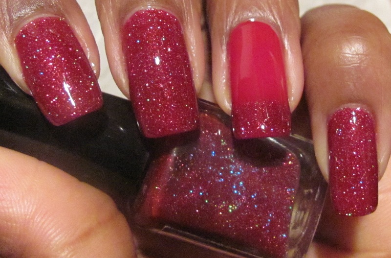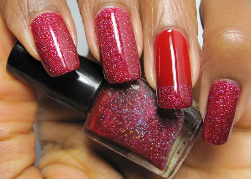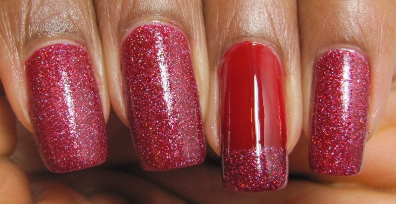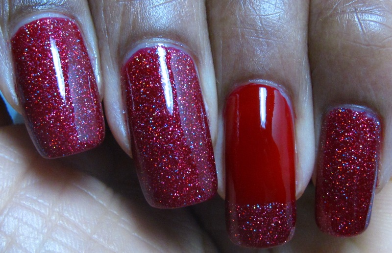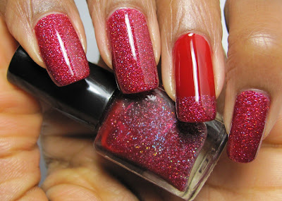COMMENTS: I grabbed Savvy - Mistletoe (shown at 2 coats on the ring finger with one coat of the franken on the tip) on sale for 99c and decided to use it to franken. The glitter used is the holo one I showed in this post. The glitter lightened up the red a bit, so I added a few drops of black to deepen the color.