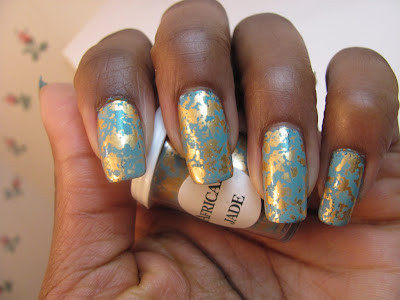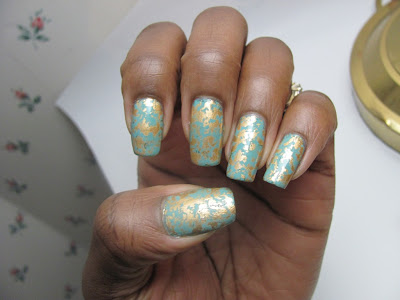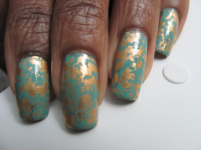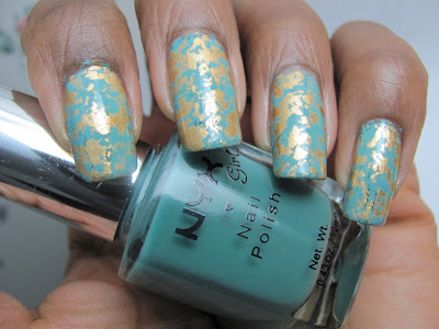 COMMENTS: So, even though I hadn't yet sorted out my topcoat dilemma, I went ahead with my foil mani. I used one coat of Nyx Girls Algae as my base color and then used a foil named African Jade which I purchased from DollarNailArt.com.