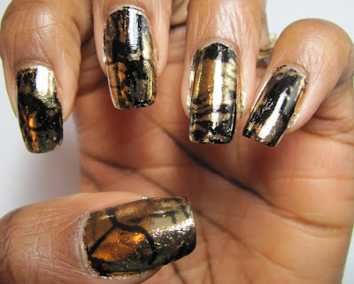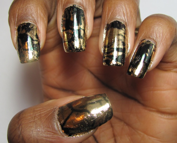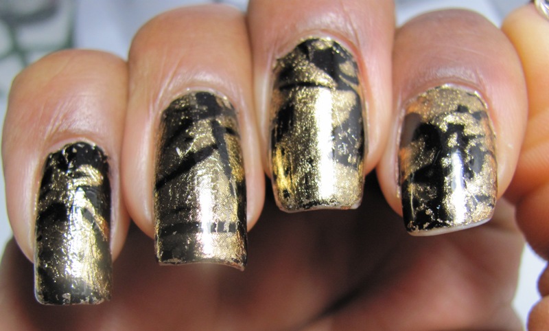 COMMENTS: I know from visiting some blogs that figuring out which topcoat to use over foils can be complicated, because they get all wrinkled/crackled if the wrong one is chosen. I decided to test out a bunch of my clear and topcoat polishes to see if I could find one that wouldn't destroy the foil. I still haven't found any. These looked so pretty before the topcoat! However, I didn't get any before photos. Here's what the polish did to the foil - I actually used a different one over each nail.