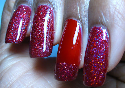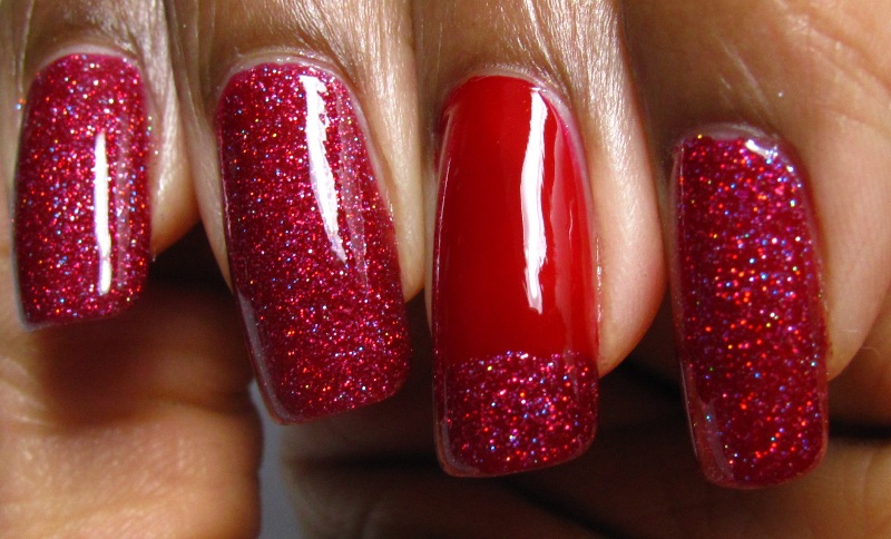 SOURCE: Holo glitter from a nail supply store, red polish -- Savvy - Mistletoe, a few drops of black, Love My Nails - Dazzling to keep the glitter suspended.