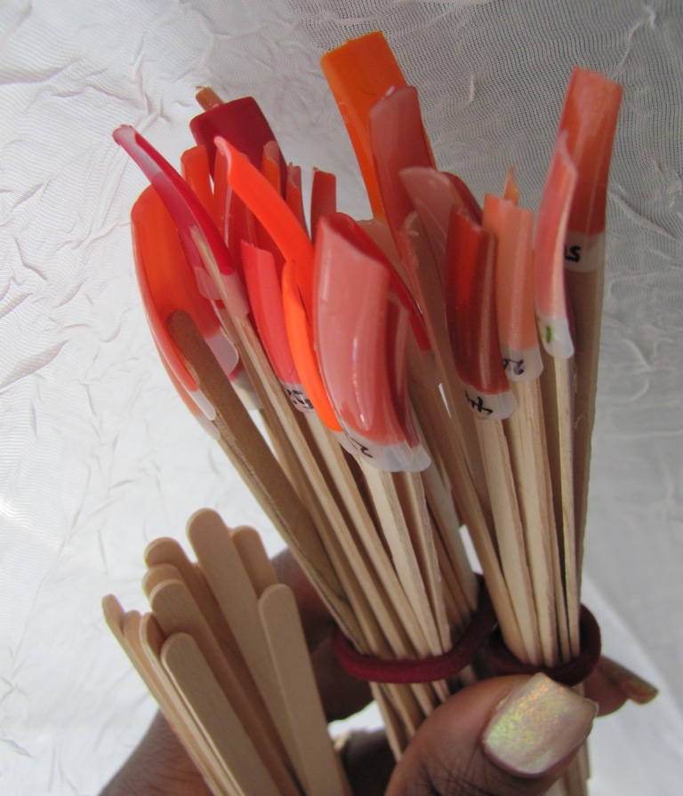 You may remember this post about how I keep track of my polishes by swatching and numbering them on fake nail tips. In that post, I showed how I store them, separated by color group, in partitioned wooden trays. As someone who shops her swatched tips instead of her bottles of polish, that wasn't working for me because I would have to dig through them to see all the colors. I also didn't want to mount them because then it would be hard to get colors side by side when I wanted to do comparisons.