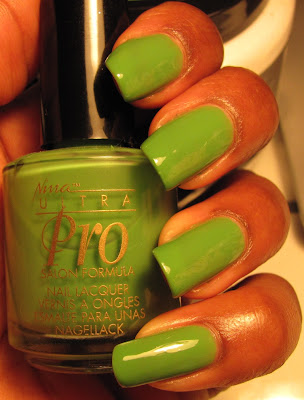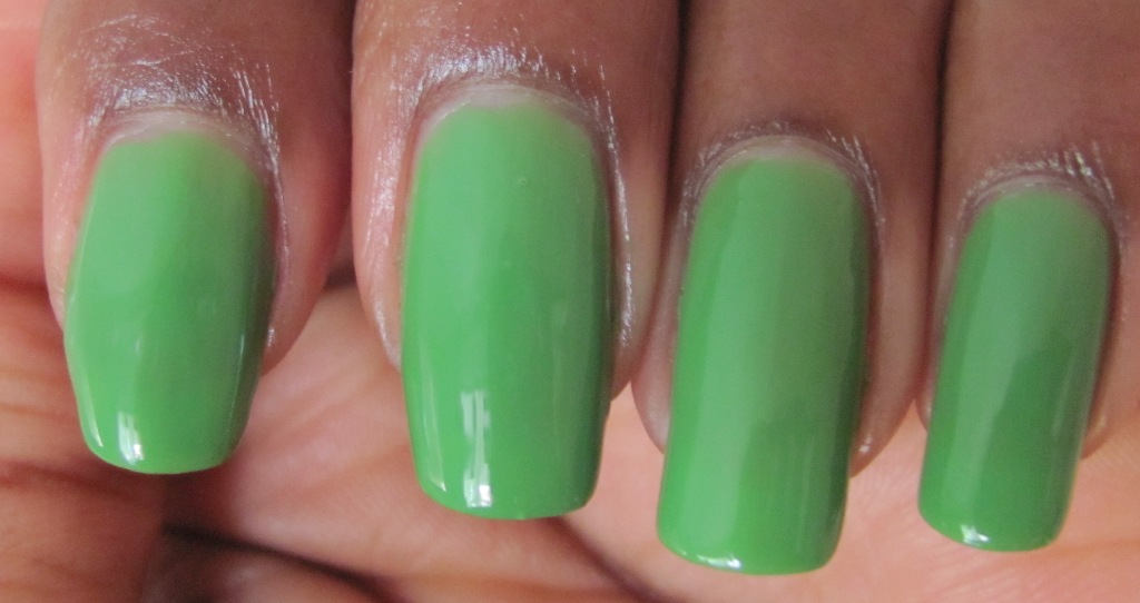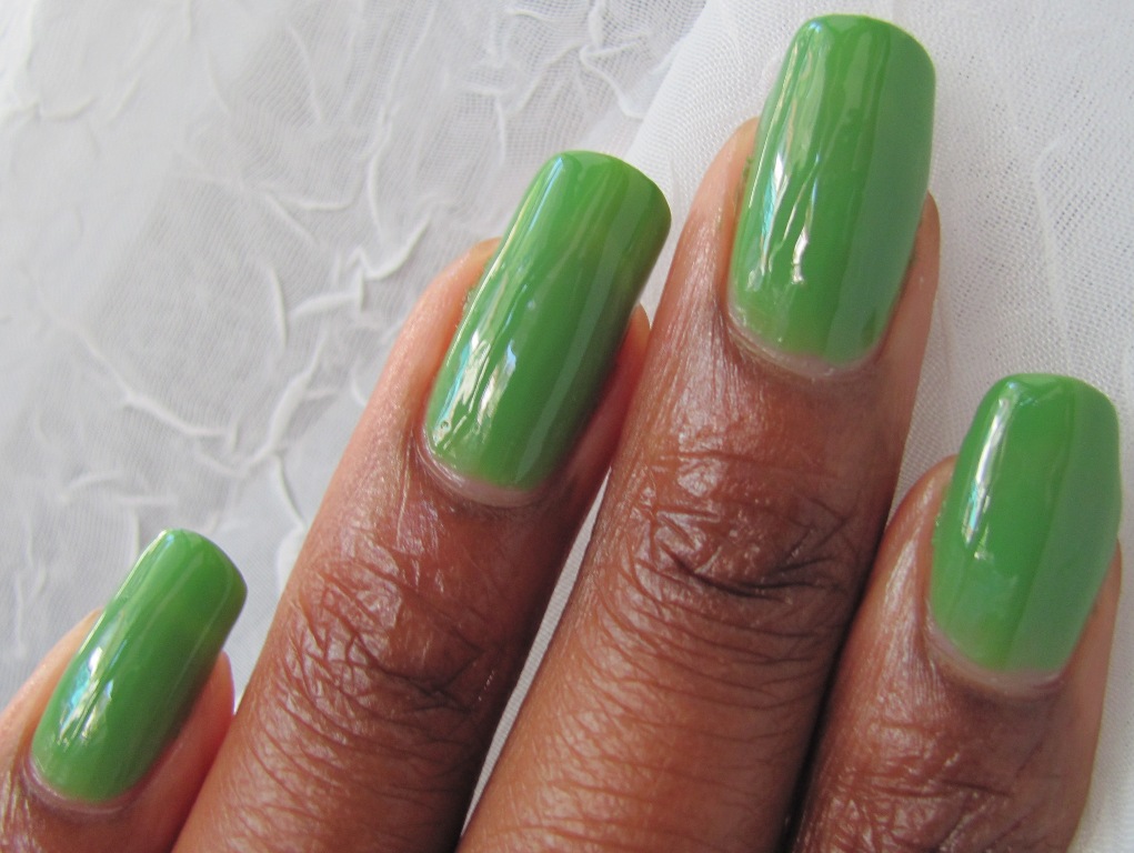 Comments: Wowser! This is a fabulouus green. It's so fresh and squishy and fresh and... Oops, getting distracted. I guess the finish is what would be called a "jelly"? I stamped the tips from Konad again - better on my left hand, but my right - not so good. Just need practice. Stamping polish was the unnamed light green pastel from Icing.