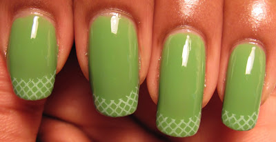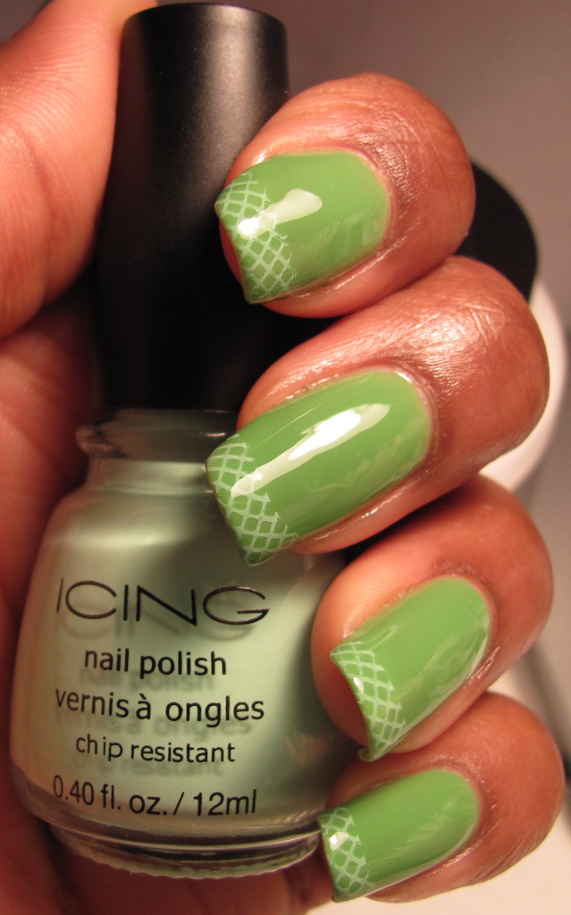 I then decided to have some fun with stamping using a Bundle Monster pattern. I used an unnamed pastel green Icing polish, and Pure Ice - Free Spirit for stamping. The Icing polish shows up more on my nails, but neither one is really stark, which I like.