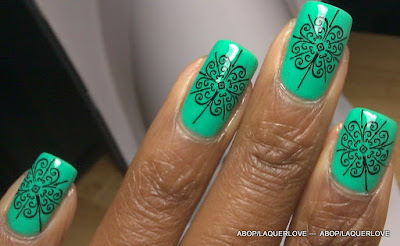 ** Estampado en esmaltes oro y plata cromado. Para mi sorpresa (y no les gusta), aunque puso una capa de acabado entre las uñas y el estampado, cuando pongo una capa final de acabado en la manicura, los colores Mia Secret pasó y manchadas los patrones estampados. Esto significa que no van a funcionar bien como bases para la estampación.