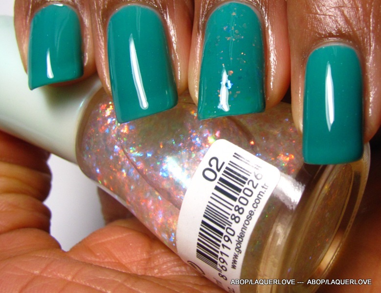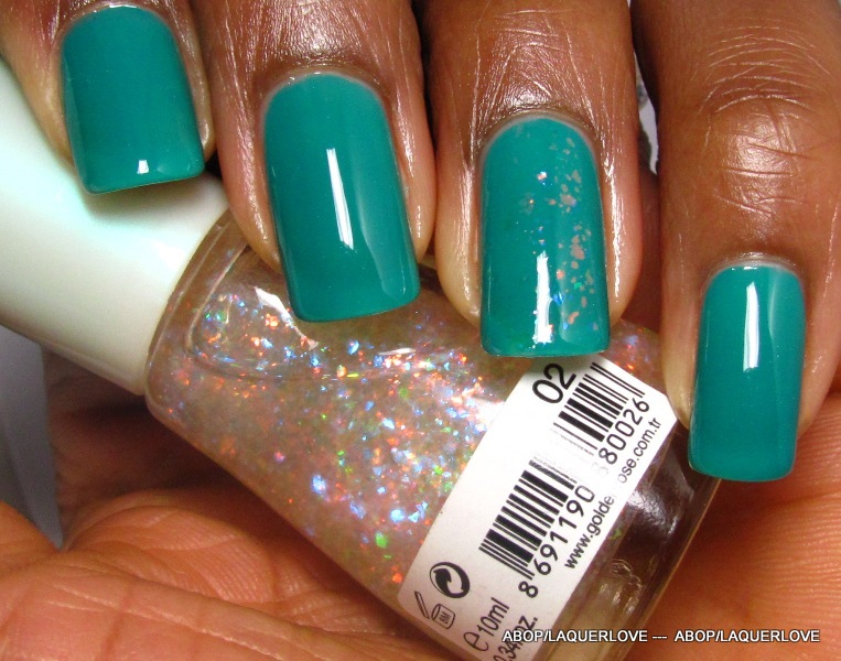 COMMENTS: I figured I'd round out my week by using another polish from this brand. This one had some super tiny specks of silver reflective pigment in it. I think it may have been just my bottle as they weren't uniformly spread out. You only notice them really close up (they look like white specs in my photo), but they weren't gritty or anything. Anyway, as usual, I put a Golden Rose Scale Effect (02) on my ring finger as an accent.