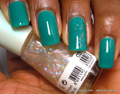 COMMENTS: Now this is what I'm talking about - a $1 polish that applies and covers and shines like a more expensive one. Why haven't I worn this before?! This was gorgeous on its own, but I just had to put some flakies over it. My ring finger was the guinea pig, so it has some other flakies on it.