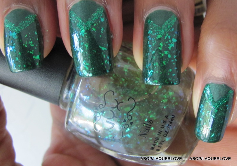 COMMENTS: I'm starting to think dark greens like this don't really suit my skin tone. Either way, the color of Veruschka is still pretty, but I much preferred the way it looked while wet to the matte finish. Purple Avenue turned into gorgeous green and aqua flakies over this. I planned to keep the top part matte, bit didn't like it, so I threw on some rhinestones and topcoat.