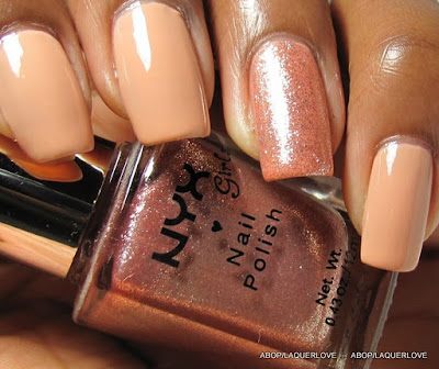 After wearing Nyx Girls - Roots on an accent nail, I was finally ready to wear it and Shimmer for a full manicure. They are both fabulous but if I had to choose one, I'd choose Roots. Shimmer has a more pink base.