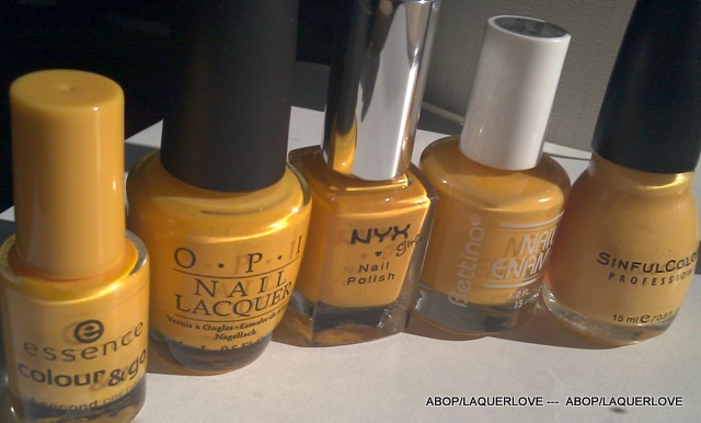 I'm trying to make my collection smaller and one good way to do that is by wearing similar colors together in a manicure. Here are five similar yellows.