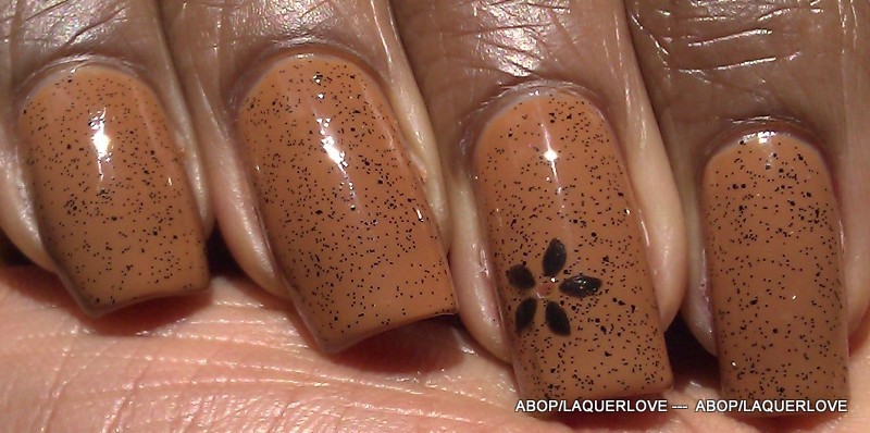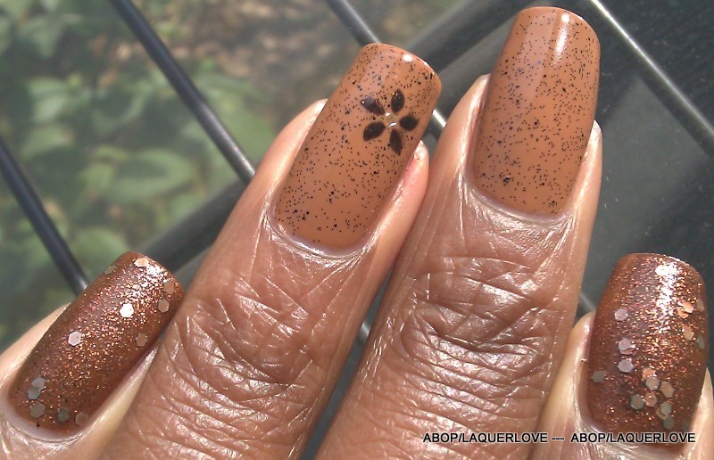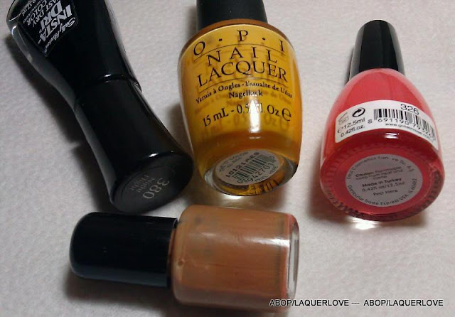 ** Tuve los esmaltes naranja y amarillo en mi caja de donación y decidió apartarse del grupo y los mezclan. El color que tengo es fabuloso, y me recuerda a dulce de leche. La capa de acabado brillo negro es también una mezcla de dos pequeños brillos.