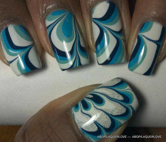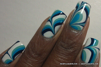 I just received some new polish in the mail, and decided to use them with some of my older ones for a water marble. It turned out nicely! Also used, on thumb only - Sally Hansen Nail Prisms - Diamond.
