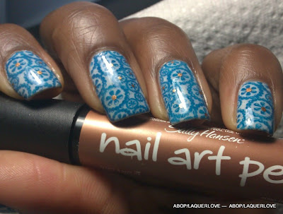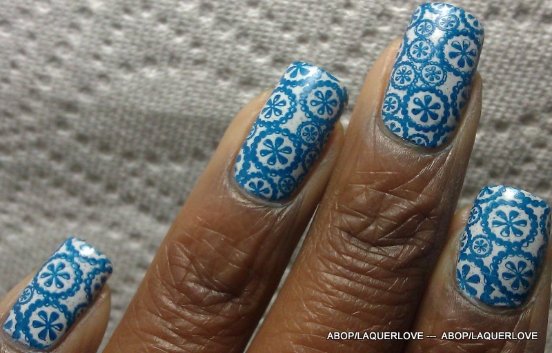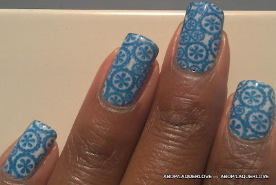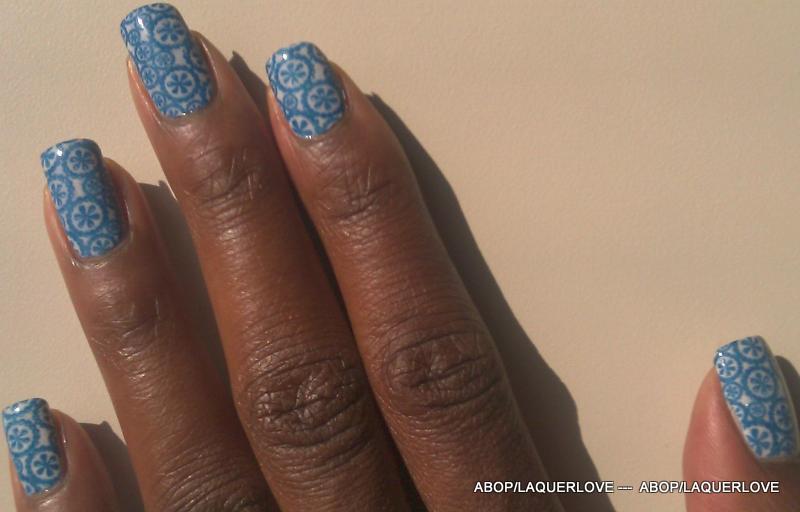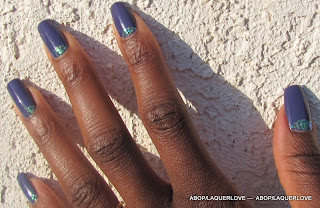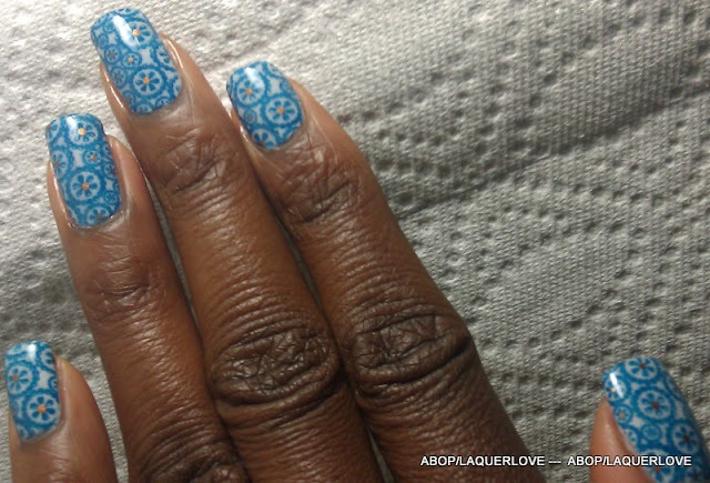 This was another manicure that didn't last more than a few minutes on me. First, the two colors aren't as close as I had hoped. Then, I stamped it but I didn't do a good job. So... I added a flower pattern on one nail, took photos, and then took it off!