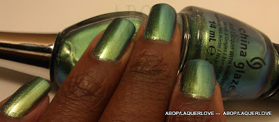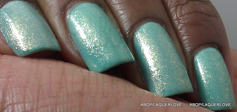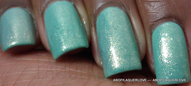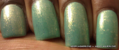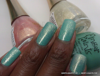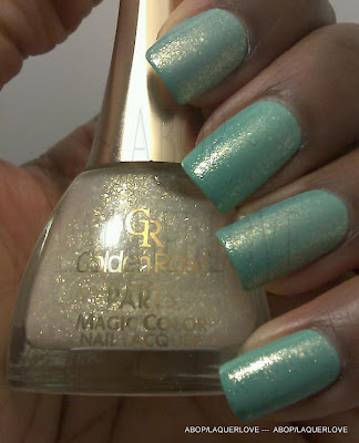 These two are very pretty polishes with shimmer and flakes for layering over other polishes, and I liked both over the green. I think the one in the pink base (305) is a little prettier because it has a little more gold shimmer.