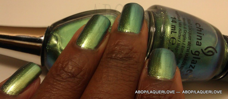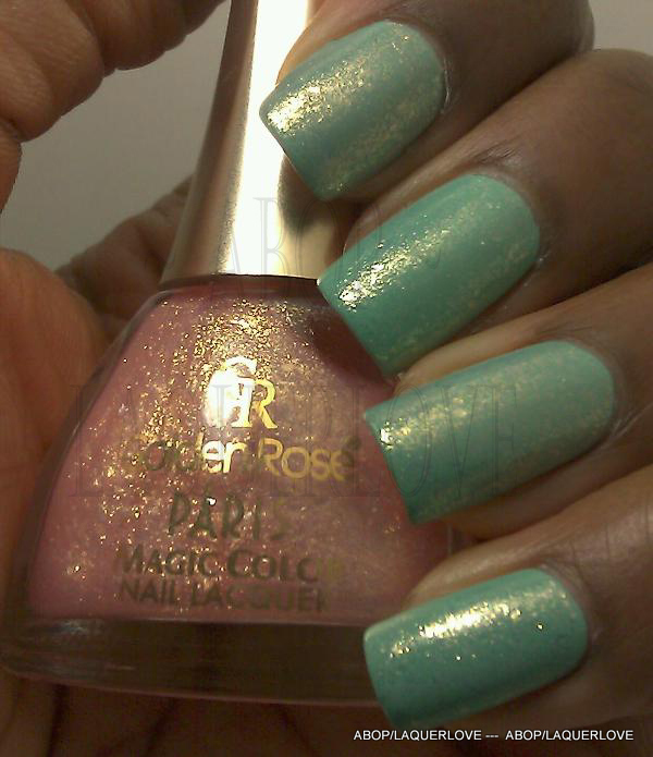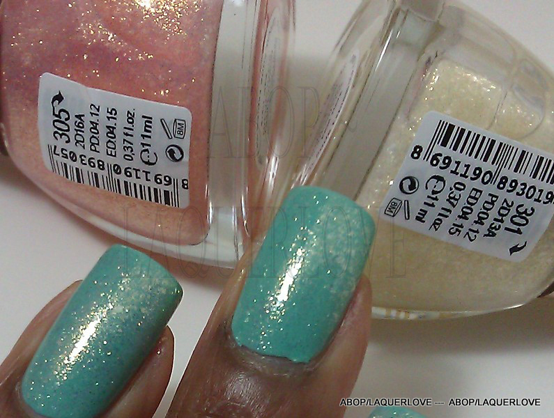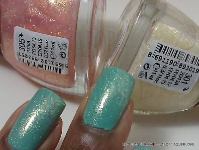 ** Estos dos son muy bonitos esmaltes con brillo y copos para capas sobre otros esmaltes, y me gustó los dos sobre el verde. Creo que el que está en la base de color rosa (305) es un poco más bonito porque tiene un poco más de brillo oro.